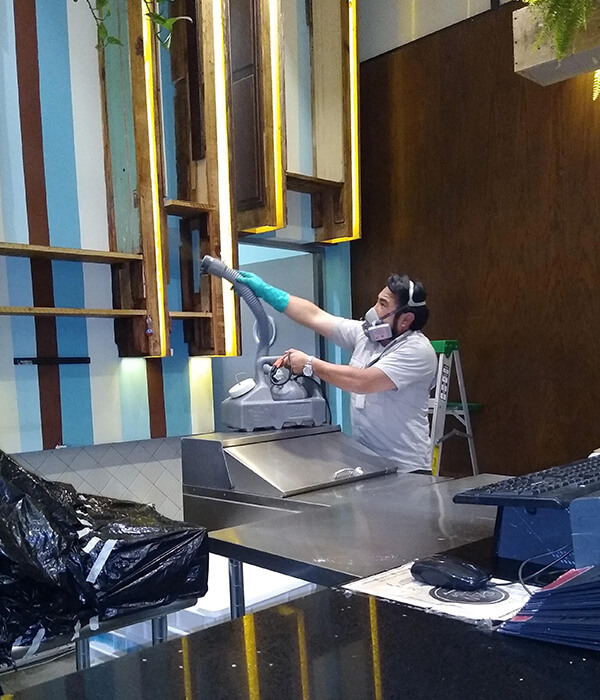 Se realizará a través de un equipo manual que comprime aire dirigiendo el disparo de la mezcla del plaguicida al ángulo que forman las paredes y pisos. Cubriendo aproximadamente 50 cm del piso hacia arriba sobre la pared y 30 cm sobre el piso, con el fin de construir una barrera de protección química cubriendo el perímetro de las áreas tratadas.